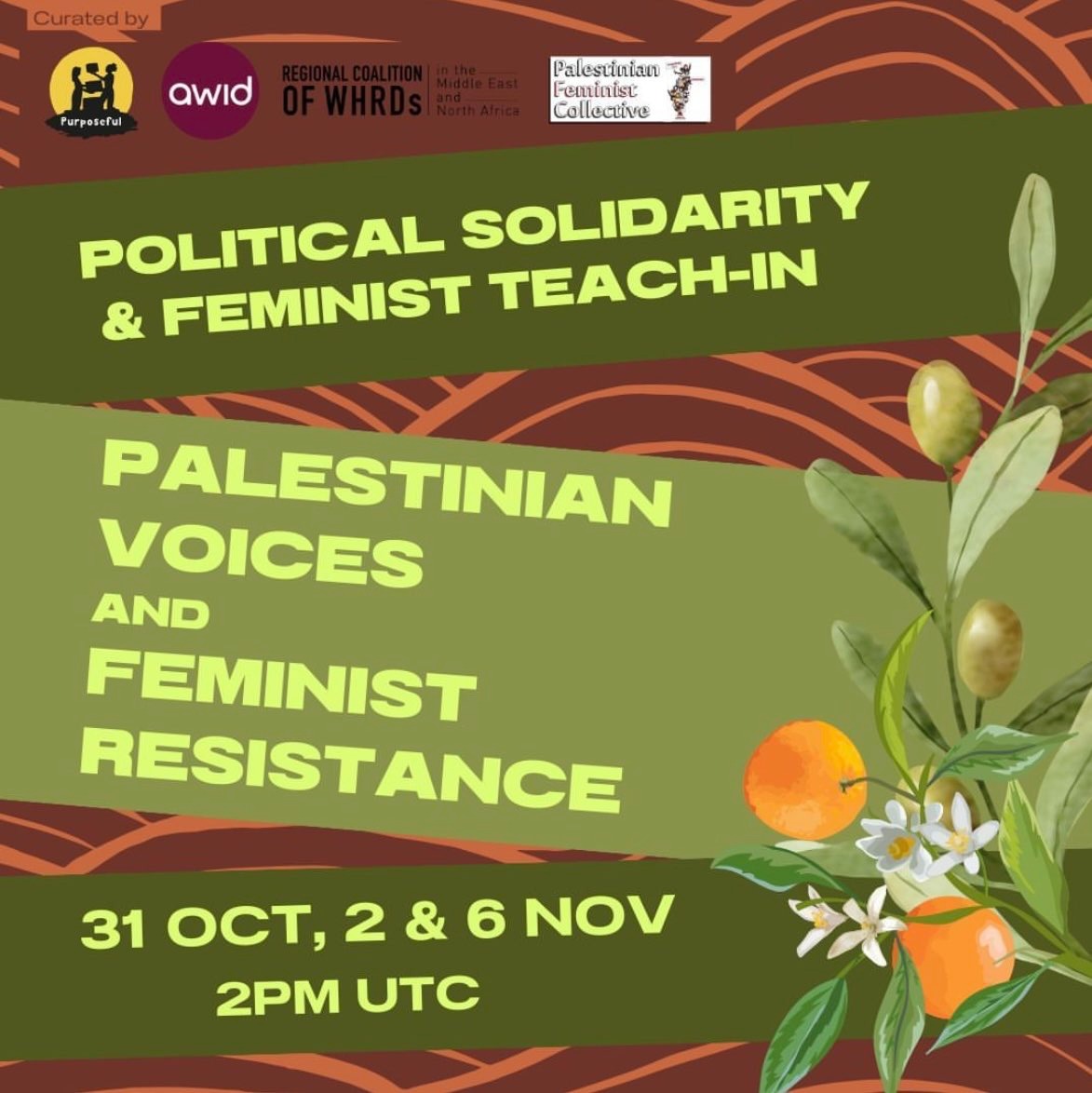 استجابةً لإلحاح وخطورة اللحظة الراهنة، انضموا إلينا في سلسلة التدريس النسوي هذه برعاية بوربسفول وجمعية حقوق الإنسان للنساء في التنمية (AWID) والتحالف الإقليمي للمدافعات عن حقوق الإنسان في الشرق الأوسط وشمال أفريقيا والمجموعة الفلسطينية النسوية مع باحثات/ين وناشطات/ين من جميع أنحاء فلسطين المحتلة. تركز هذه المحادثات المتشابكة على وجهات نظر نسوية أصلية وذات نهج مجتمعي التي تعتمد على الحقائق الحية والتنظيم الجماعي. كل ذلك بهدف كشف حقيقة ما يحدث، وكيف يمكننا المساهمة بشكل هادف وعاجل في التضامن السياسي والسرد المضاد.