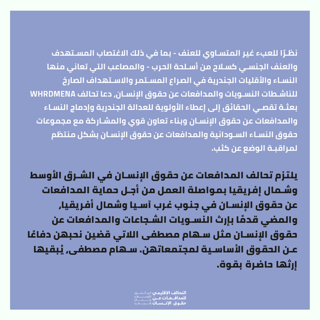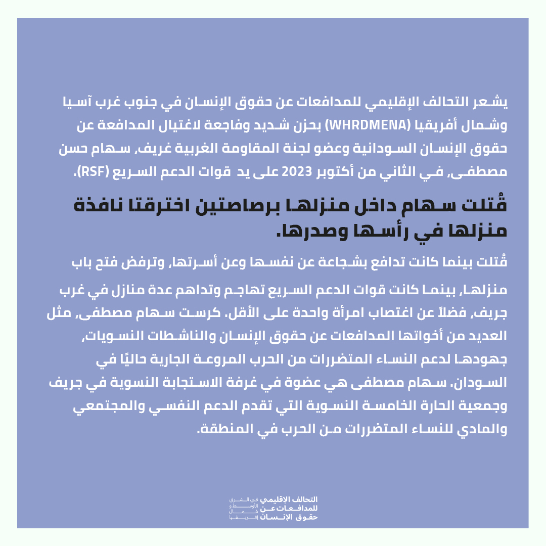 السودان: اغتيال المدافعة عن حقوق الإنسان سهام حسن مصطفى بسبب عملها في الاستجابة النسوية الطارئة مع النساء المتضررات من الحرب