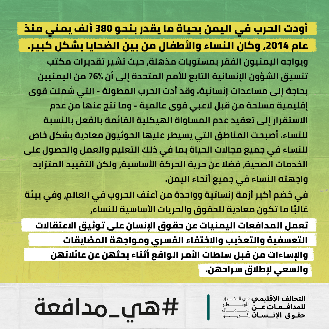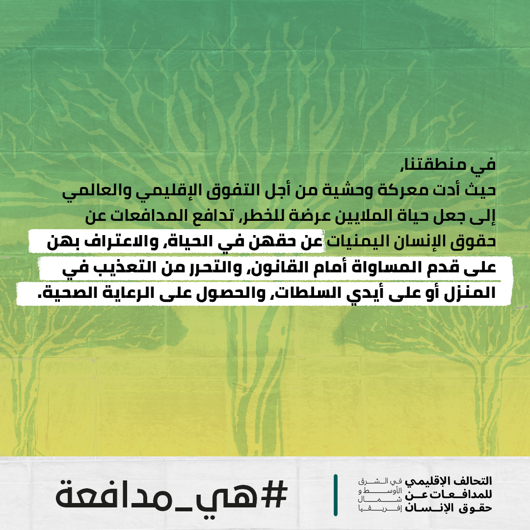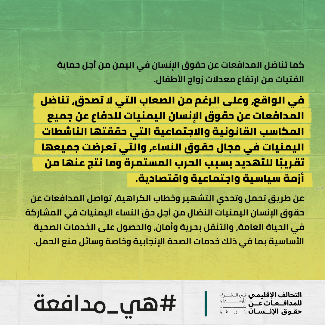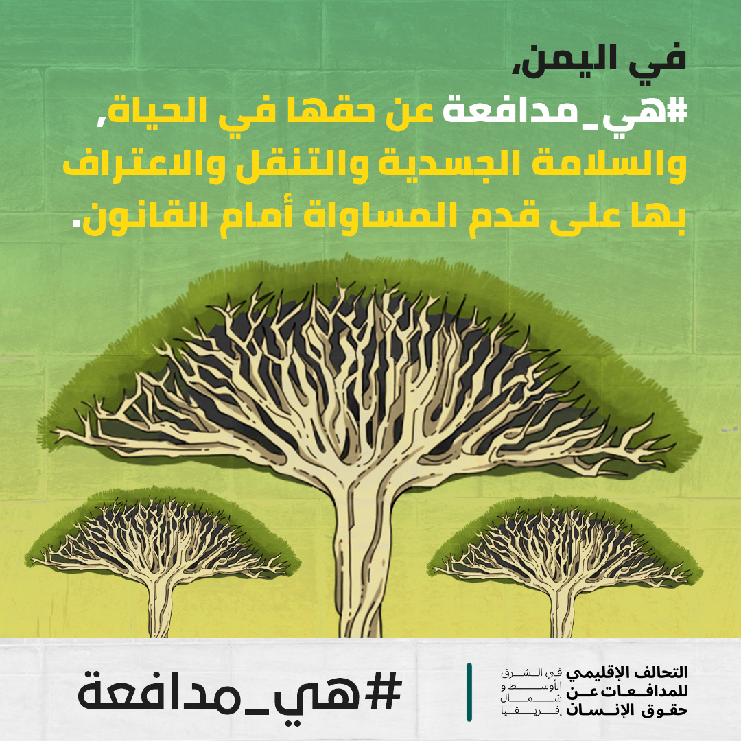 في اليمن #هي_مدافعة عن حقها في الحياة والسلامة الجسدية والتنقل والاعتراف بها على قدم المساواة أمام القانون.