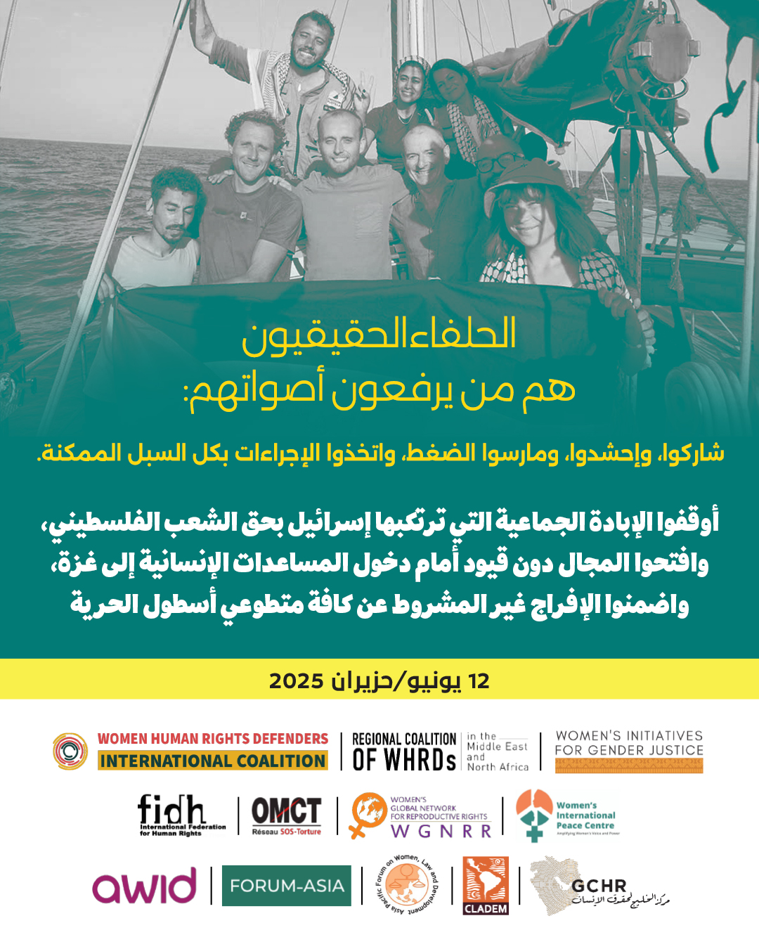 ندعو القرّاء والموقّعين على هذا البيان إلى مواصلة الضغط على كافة الحكومات المعنية لضمان الإفراج غير المشروط عن كافة المحتجزين من طاقم سفينة “مادلين”، كما طالبت بذلك حملة أسطول الحرية (FFC). كما ندعوكم إلى إرسال هذا البيان إلى الدول الأعضاء الـ47 في مجلس حقوق الإنسان التابع للأمم المتحدة، والدول الـ15 الأعضاء في مجلس الأمن الدولي.