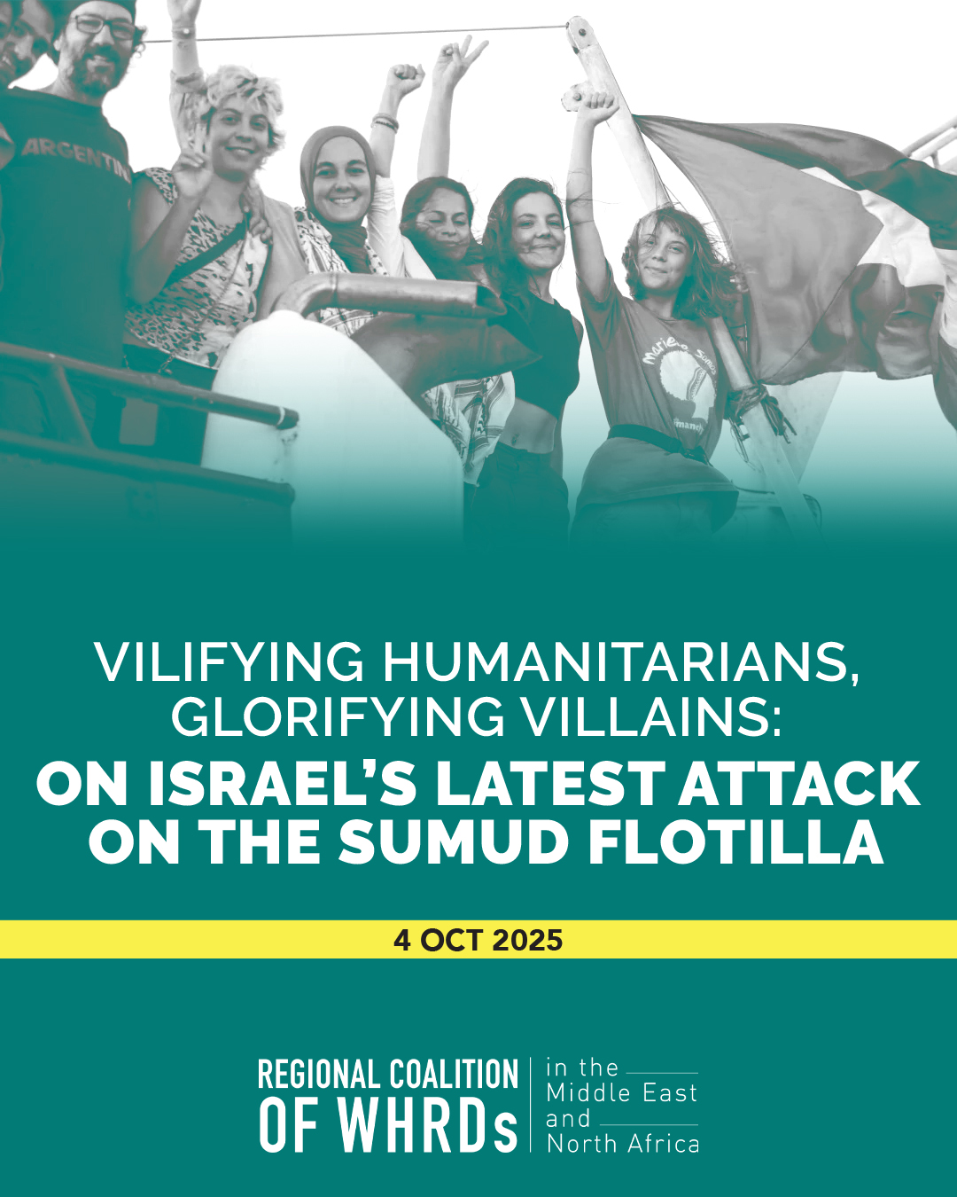The Regional Coalition for Women Human Rights Defenders in South West Asia and North Africa (WHRDMENA) is not surprised, yet appalled and utterly repulsed, by the interception of the Global Sumud Flotilla during the early hours of 2 Oct 2025, where “more than 20 vessels (attacked) 44 ships” of the courageous Flotilla. In classic Zionist fashion, the occupation is trying to once again, use expensive propaganda campaigns to gain sympathy.