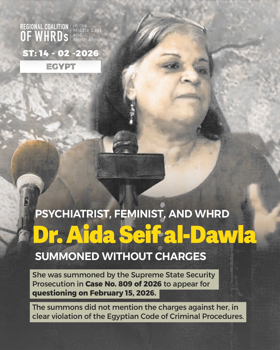 The Regional Coalition for Women Human Rights Defenders in Southwest Asia and North Africa (WHRDMENA) condemns the summons of psychiatrist, feminist, and woman human rights defender (WHRD) Dr. Aida Seif al-Dawla, who learned on Wednesday, February 11, 2026, that she had been summoned by the Supreme State Security Prosecution, which was delivered to her by the Dokki Prosecution, in case No. 809 of 2026, requiring her to appear for questioning at the Supreme State Security Prosecution on Sunday, February 15, 2026. The summons did not mention the charges against her (1). The failure to announce the charges against Dr. Aida Seif al-Dawla is a clear violation of the Egyptian Code of Criminal Procedures, which stipulates that the charges to be considered and investigated in the summons must be announced, which did not happen in the summons received by Dr. Aida Seif al-Dawla.