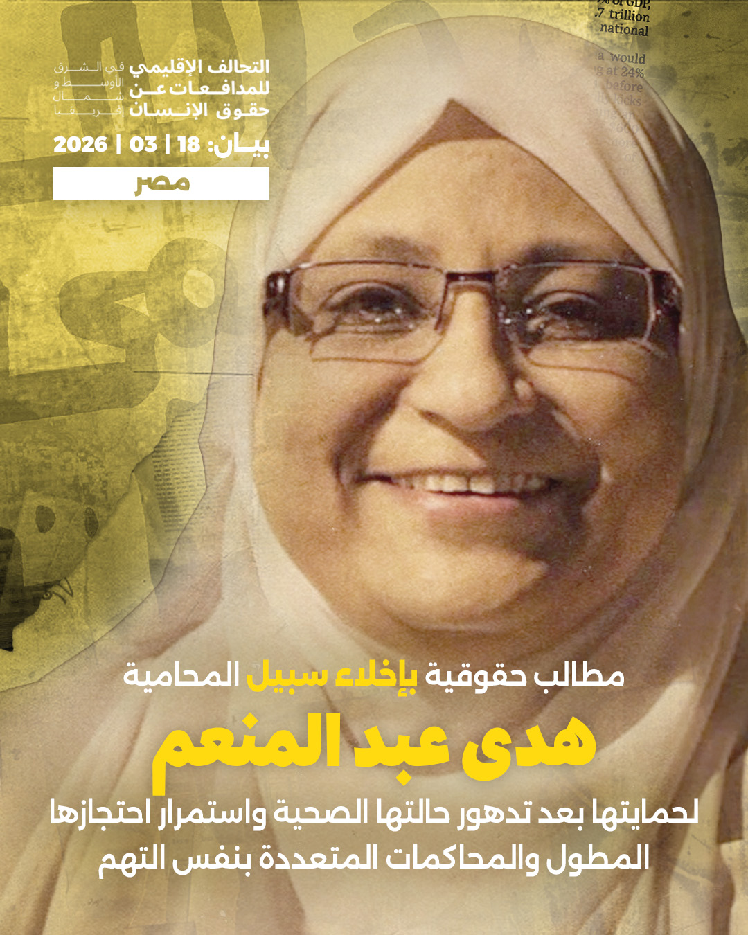 يٌطالب التحالف الإقليمي للمدافعات عن حقوق الإنسان في جنوب غرب آسيا وشمال أفريقيا (WHRDMENA) والمنظمات الموقعة بإخلاء السبيل الفوري للمدافعة عن حقوق الإنسان والمحامية هدى عبد المنعم لإنقاذ حياتها، ووقف الإجراءات التعسفية ضدها، على الرغم من تعيينها سابقاً عضوة بالمجلس القومي لحقوق الإنسان. كما يدعو التحالف المجموعات والمنطمات الحقوقية والنسوية المحلية والإقليمية والدولية إلى التضامن الكامل مع عبد المنعم والمطالبة بإخلاء سبيلها الفوري، خاصة في ظل الاستهداف المتصاعد من قبل السلطات المصرية للمدافعات عن حقوق الإنسان في الفترة الأخيرة.