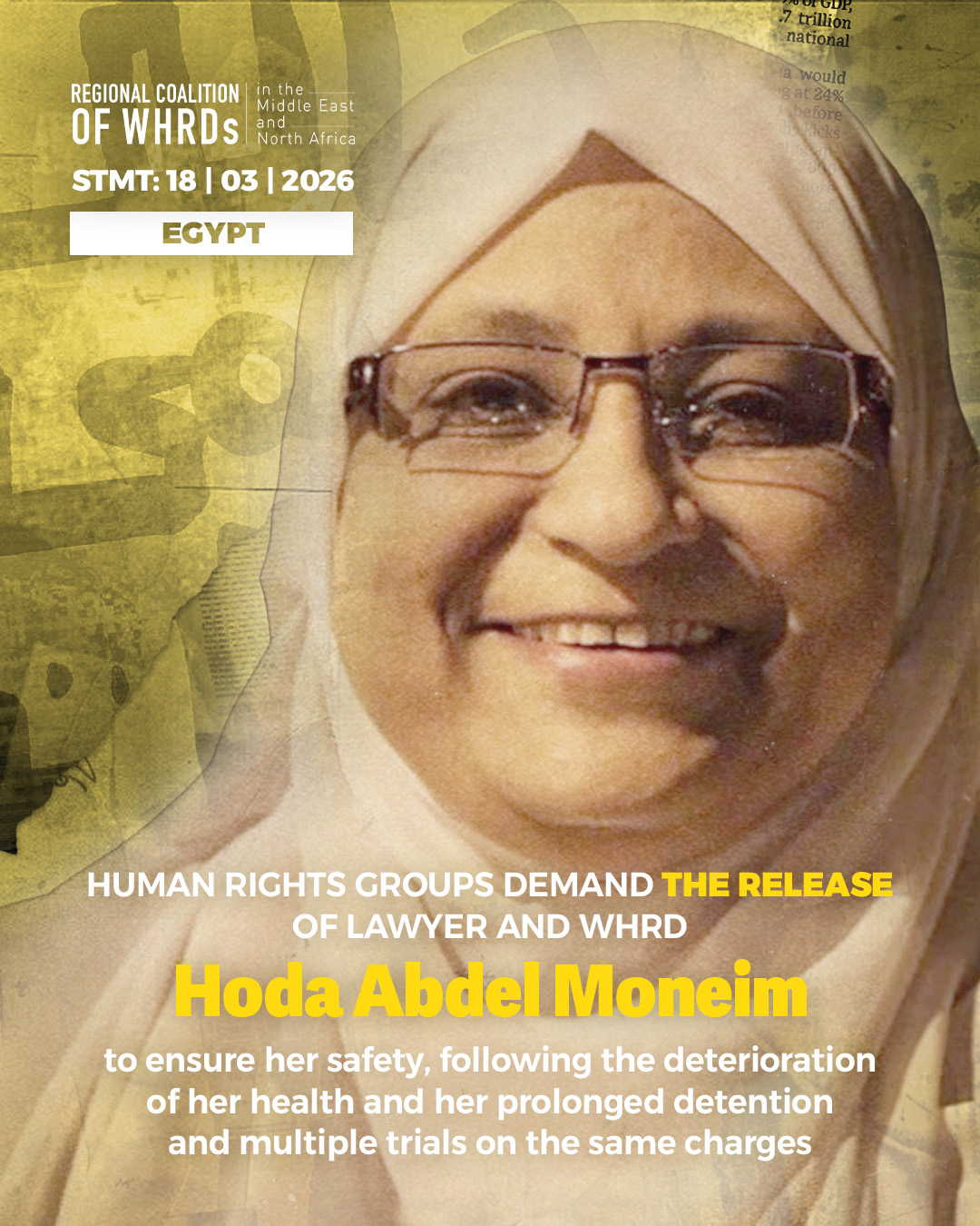 The Regional Coalition for Women Human Rights Defenders in South West Asia and North Africa (WHRDMENA) and the undersigned organizations express their deep concern and strong condemnation regarding the health condition of lawyer and woman human rights defender (WHRD) Hoda Abdel Moneim in detention, which has led her to request exemption from attending court sessions and to be represented solely by her lawyer and her husband, Mr. Khaled Badawi, due to the extreme hardship she faces in being transported from the Correctional and Rehabilitation Center in 10th of Ramadan City, Sharqia Governorate, to the venue of her trial at the Badr Complex, specifically the Second Terrorism Circuit, a request that was rejected by the same court at the Badr Security Complex (1).