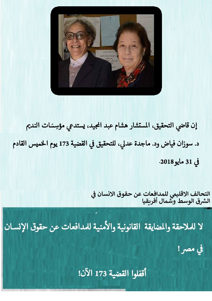 مصر: لا للمضايقةِ القانونيةِ للمدافعتينِ د.سوزان فياض ود.ماجدة عدلي