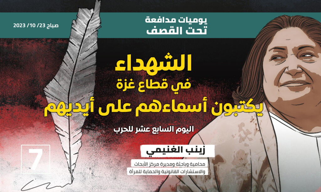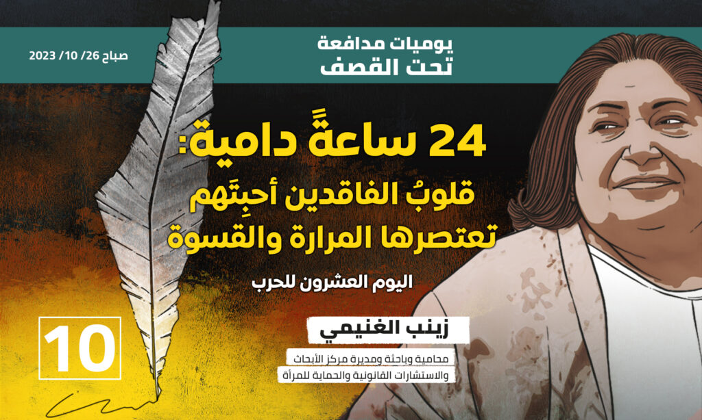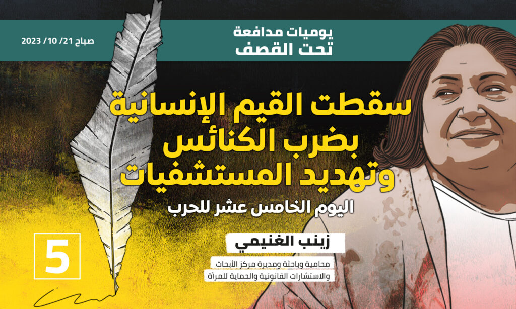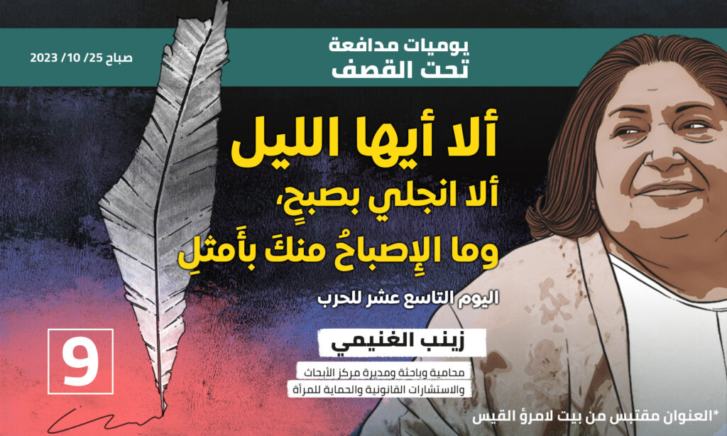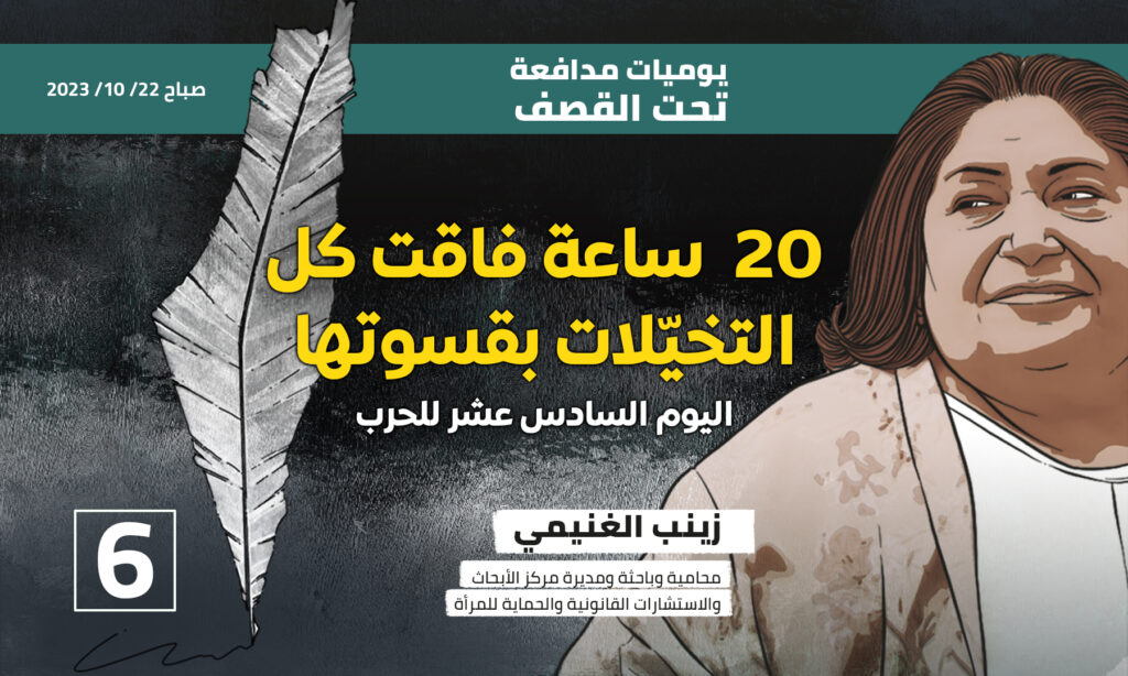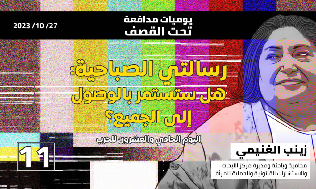 إقرأ أيضا: يوميات مدافعة تحت القصف ١ ، ١٧ أكتوبر ٢٠٢٣ يوميات مدافعة تحت القصف ٢، ١٨ أكتوبر ٢٠٢١