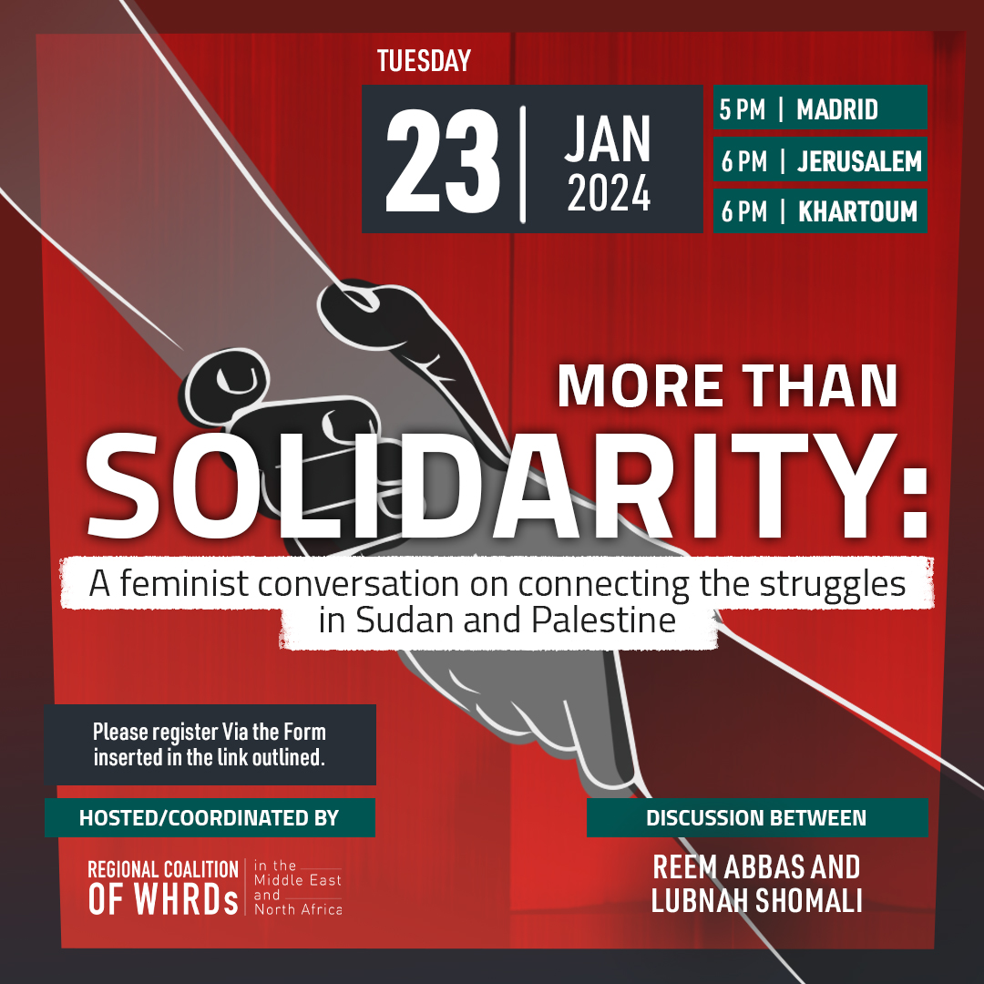 An online panel discussion hosted by The Regional Coalition of Women Human Rights Defenders in South West Asia and North Africa (WHRDMENA)  that will bring together Sudanese and Palestinian feminists to discuss the similarities and direct links between their respective struggles under the title “More than solidarity: A feminist conversation on connecting the struggles in Sudan and Palestine”.