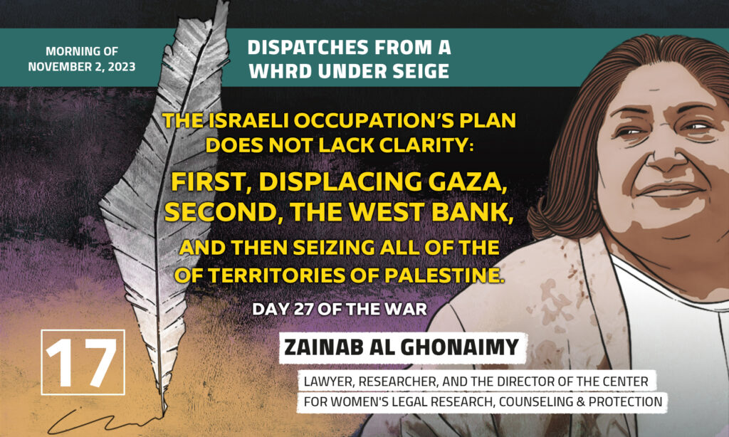 Dispatches From a WHRD Under Seige: The Israeli Occupation’s Plan Does Not Lack Clarity: First, displacing Gaza, Second, the West Bank, and then seizing all of the of territories of Palestine.