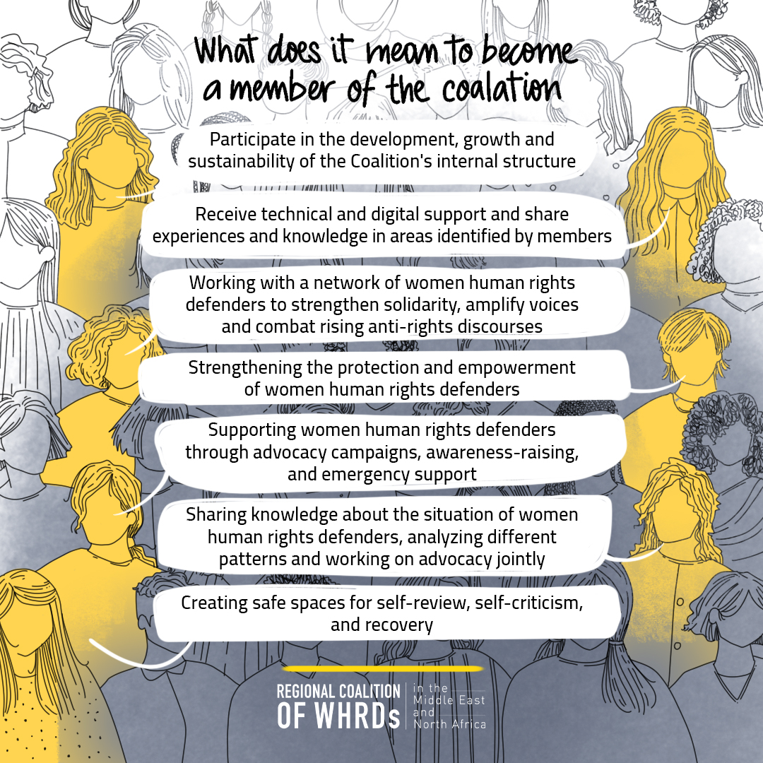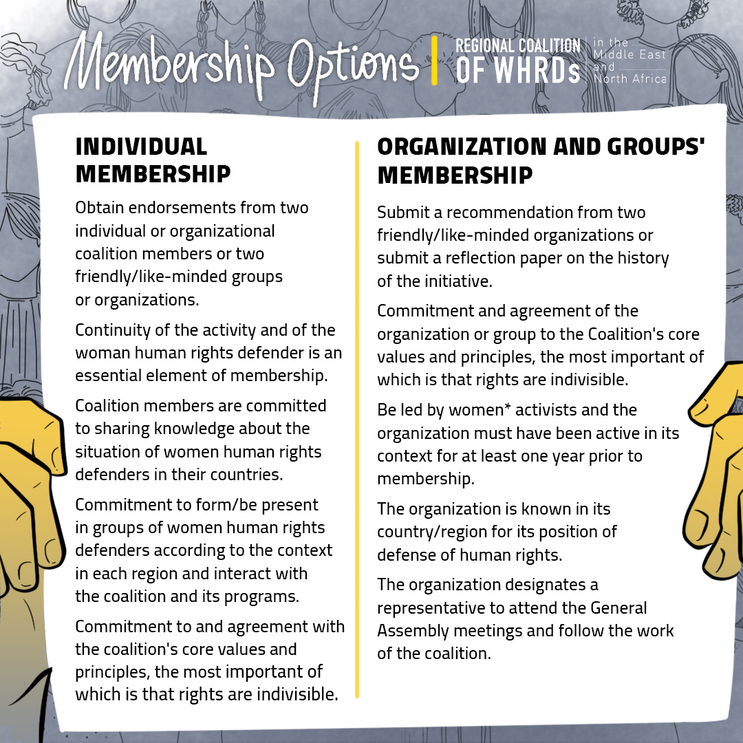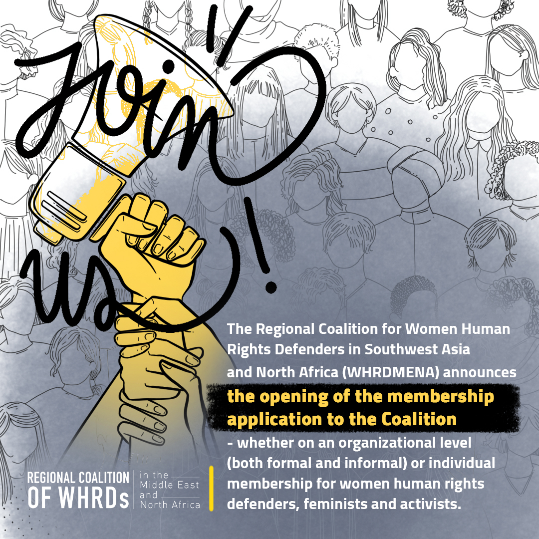 With this in mind, the Regional Coalition for Women Human Rights Defenders in Southwest Asia and North Africa (WHRDMENA) announces the opening of the membership application to the Coalition – whether on an organizational level (both formal and informal) or individual membership for women human rights defenders, feminists and activists – by filling out the membership application form shown below, taking into account the membership conditions and learning about the values that govern the work of the WHRDMENA.