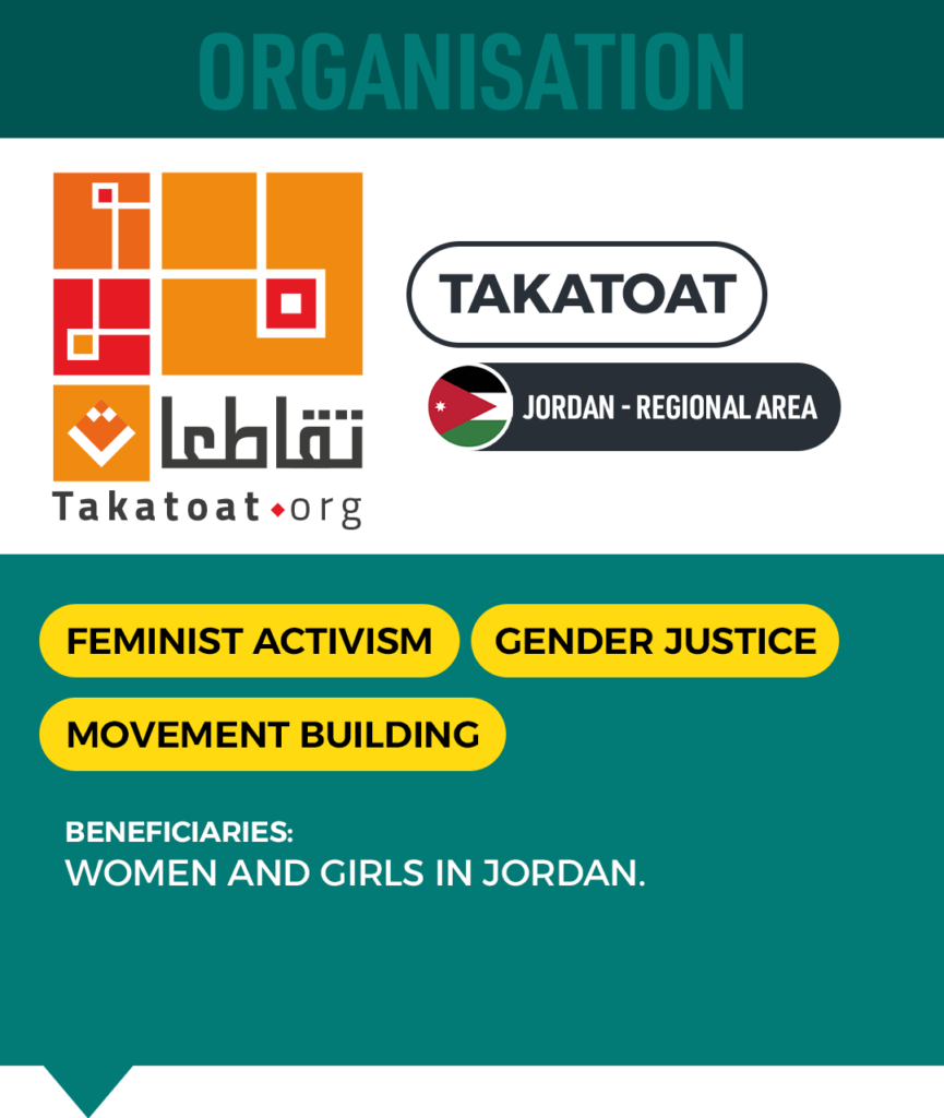 Takatoat is a Jordan-based feminist collective founded in 2020 in response to gender-based violence and systemic discrimination. Committed to feminist awareness and solidarity, the group mobilizes for social justice, engages women and girls in activism, and produces intersectional feminist knowledge. Takatoat works locally and regionally to strengthen feminist movements and amplify diverse voices.