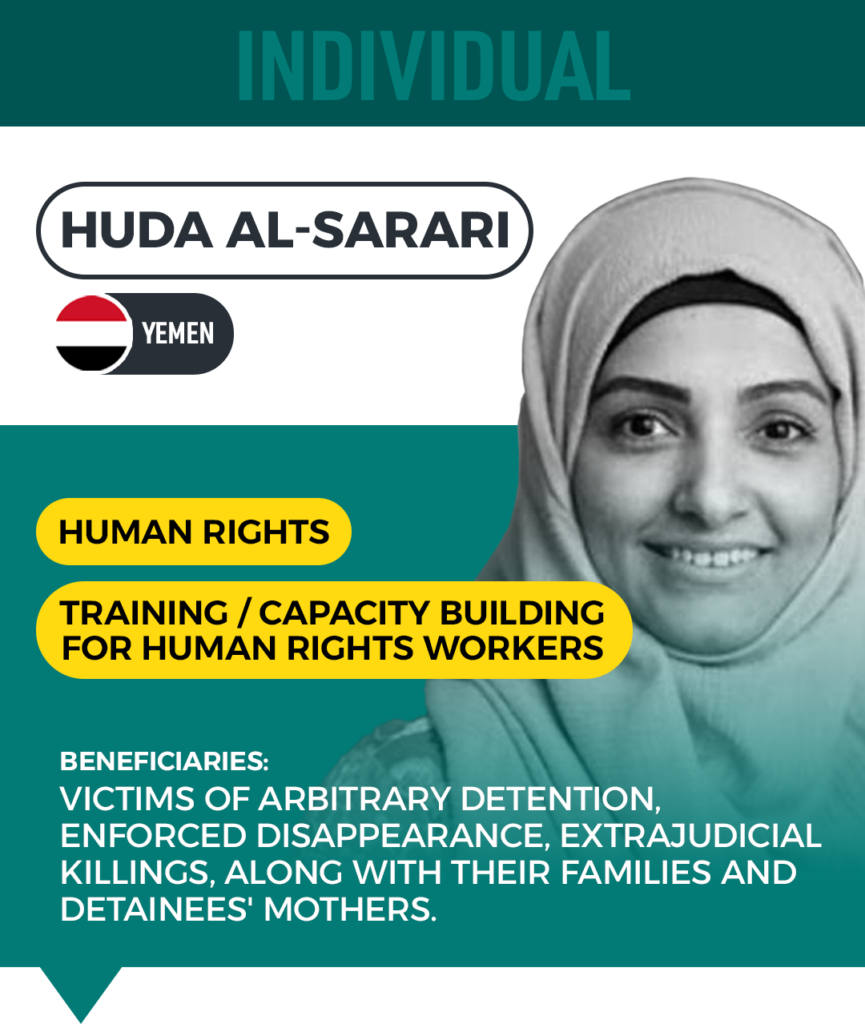 Huda Al-Sarari is committed to defending human rights by raising awareness of national and international laws and promoting a culture of rights and justice in society. She works to protect victims of arbitrary detention and advocates for the families of enforced disappearance victims and those affected by extrajudicial killings.