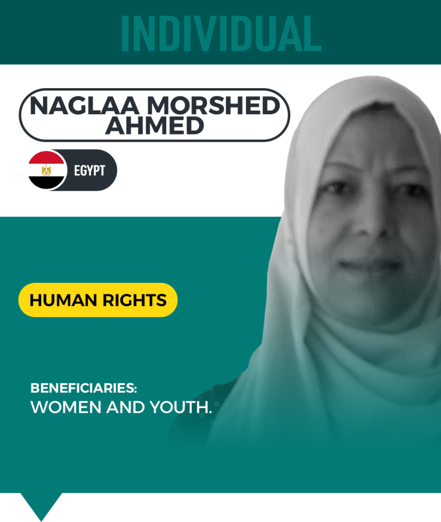 Naglaa works on spreading the culture of human rights and launching advocacy campaigns to improve human rights conditions and enhance social accountability. Her work focuses on supporting women’s participation in decision-making processes and empowering them in political and social spheres.