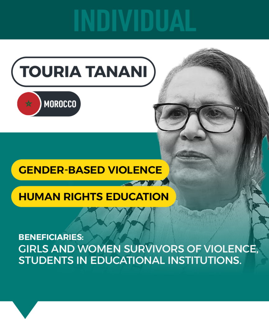 Touria Tanani, a dedicated human rights activist, fights gender-based violence and empowers survivors. An individual alliance member, she also serves on the executive board of IPDF, a Moroccan women’s rights organization. She advocates for legal reforms and a democratic, egalitarian society where women and girls can thrive.