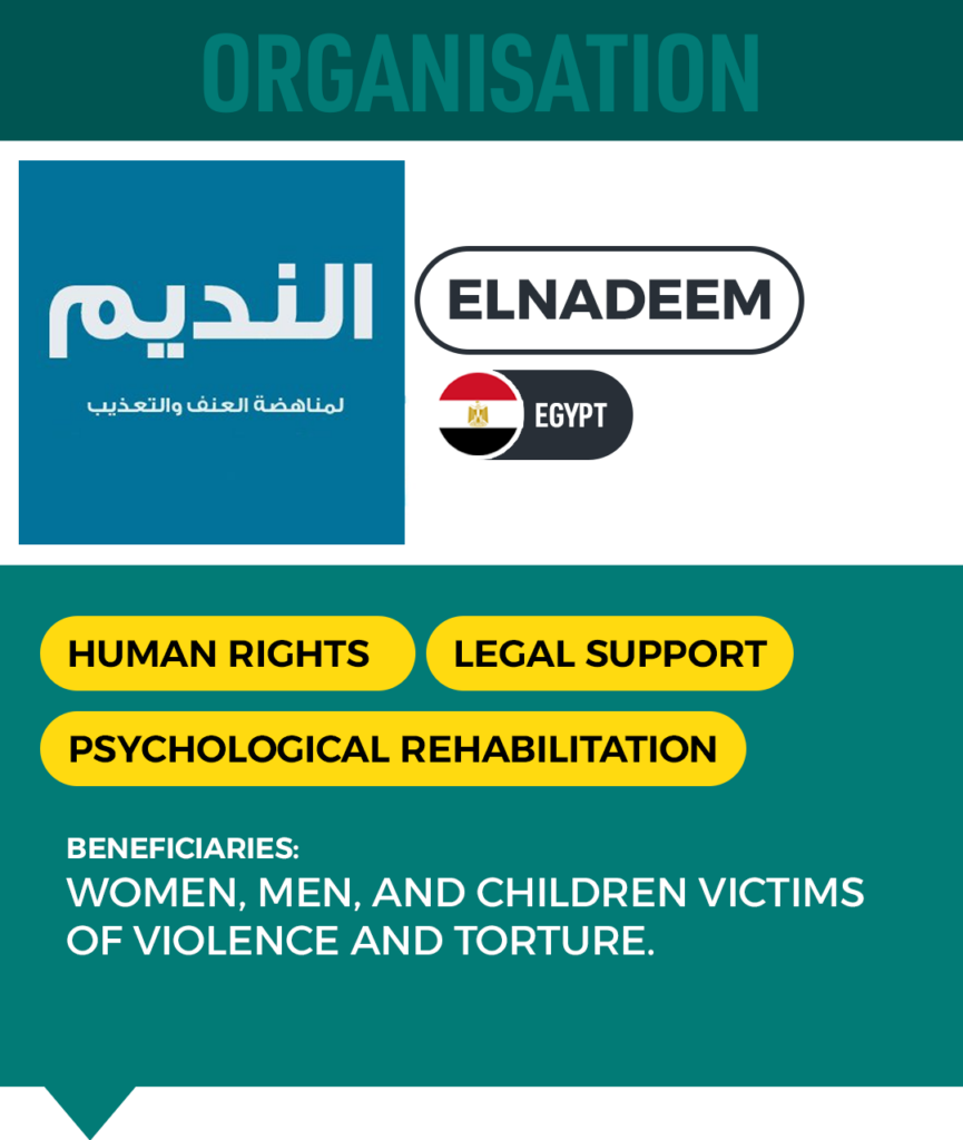 Nadeem Center is an Egyptian NGO founded in 1993, dedicated to providing psychological and legal rehabilitation services for torture and violence victims. The center works to raise public awareness through campaigns and the publication of survivor testimonies. It also helps women victims of violence and is a founding member of the Aman Network, which combats torture in North Africa and the Middle East. Nadeem organizes regional training programs to enhance psychological support skills for torture survivors. Since its inception, the center has assisted over 3,000 torture victims and contributed to documenting torture cases in Egypt and other countries.