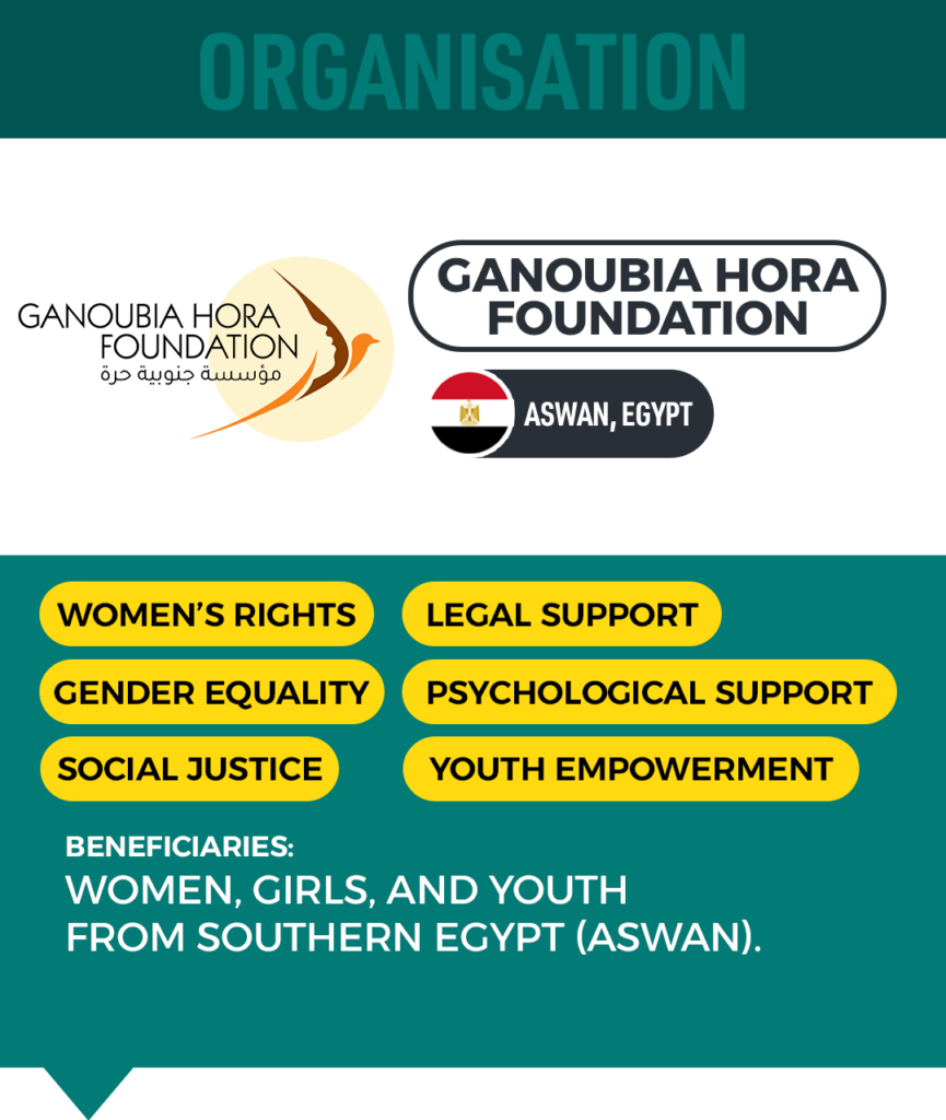 Ganoubia Hora Foundation is a feminist organization based in southern Egypt, particularly Aswan. Established in 2012, the organization focuses on gender equality, empowering women, and dismantling patriarchal systems through various initiatives. It works on issues such as tribalism, gender-based violence, and the marginalization of southern women, advocating for their social, political, and legal rights. The foundation provides legal, technical, and psychological support, as well as awareness and training programs to ensure women in southern Egypt have the tools to fight for their freedom and rights.